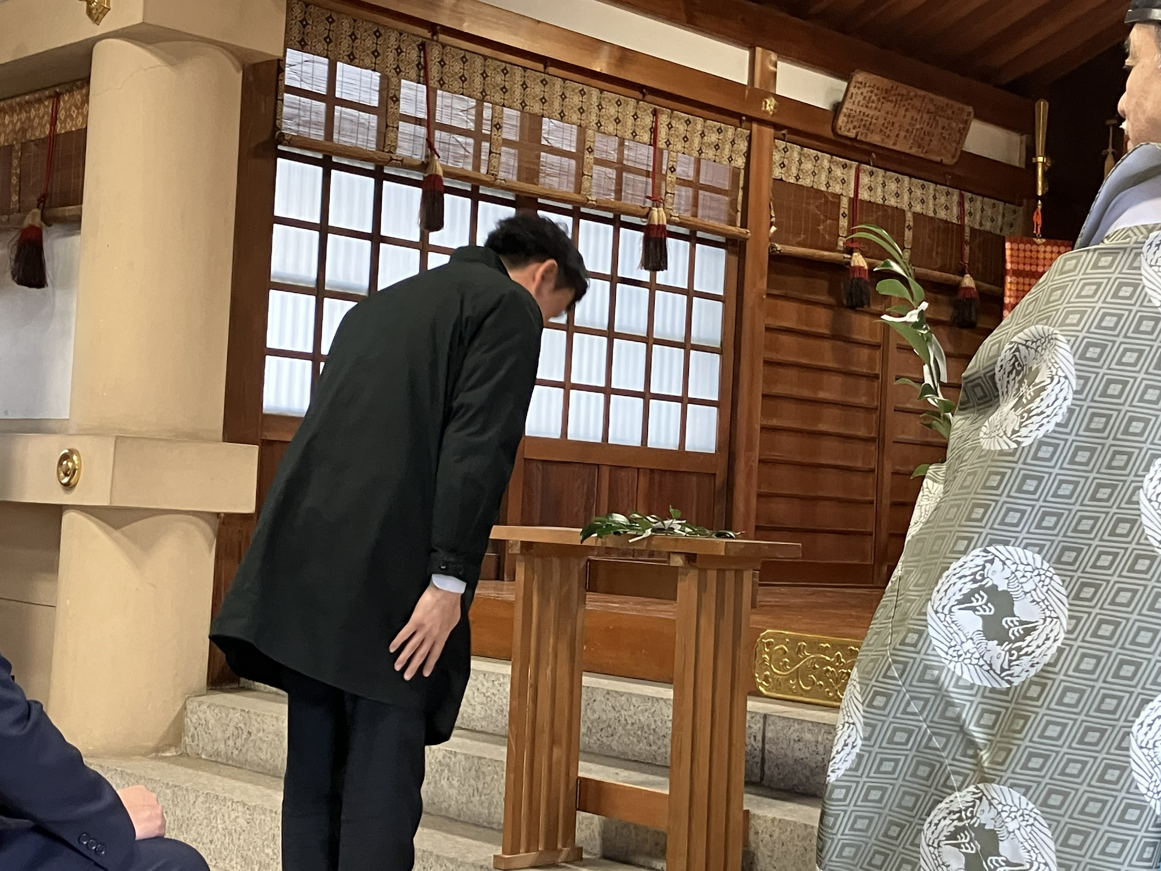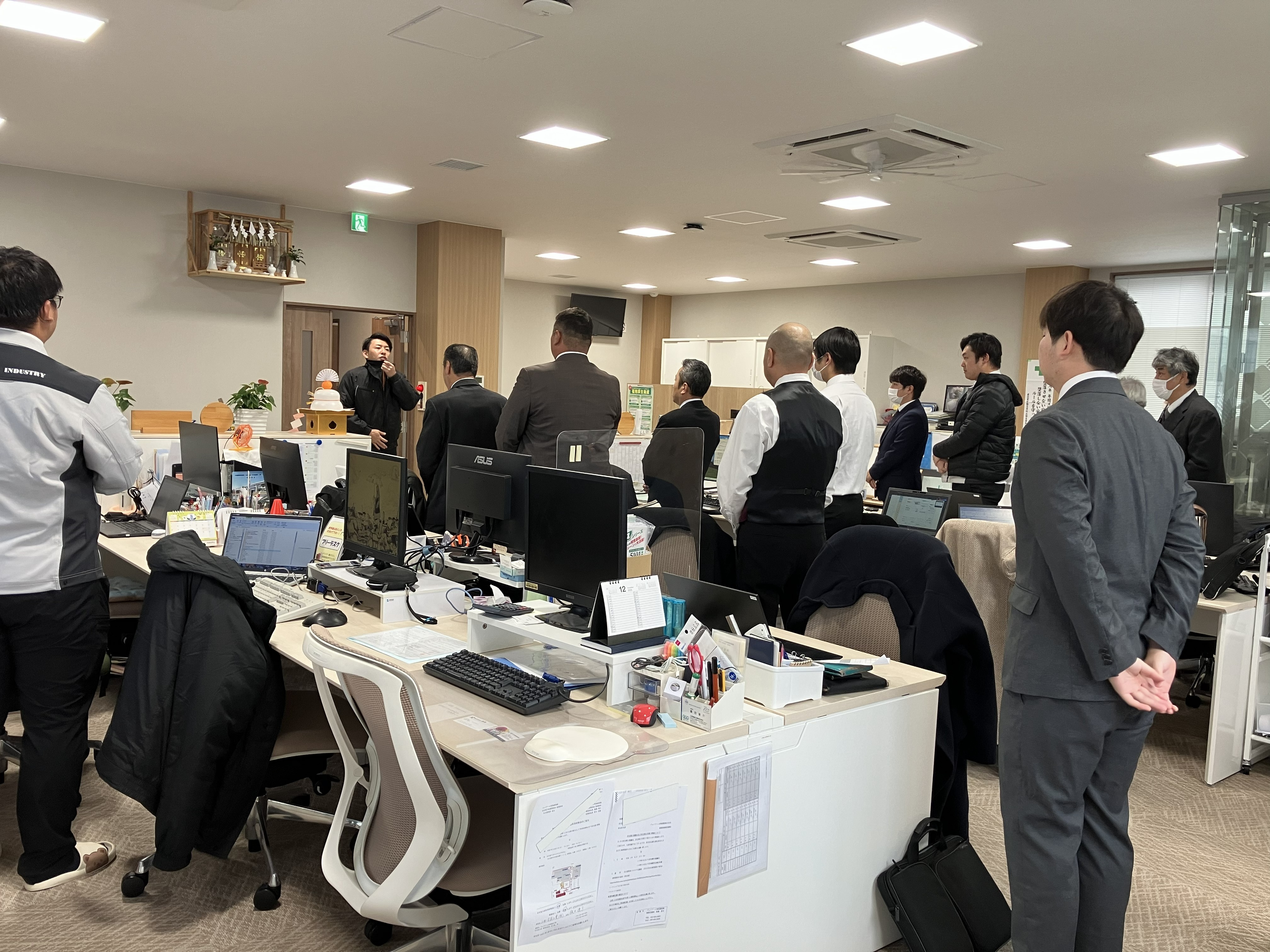 昨年と同様、安全祈願は地域の氏神神社である「下中八幡宮」で、本社社員が出席して執り行われました。今年は出席していただいた協力会社の方々と共に工事安全、交通安全、身体健全を祈願し、新たな1年の始まりとなりました。安全祈願後、直会として、参加者全員で食事をいただきました。